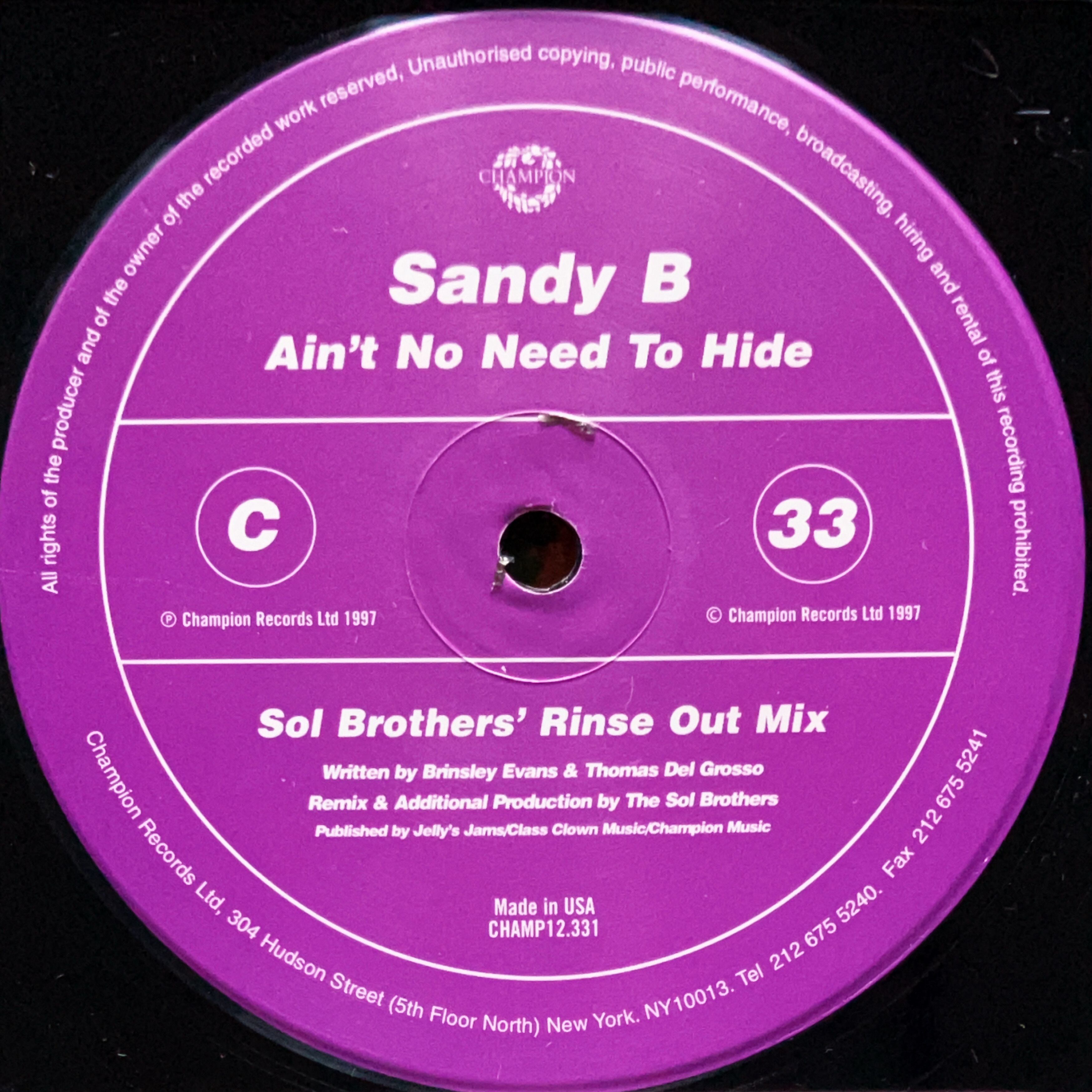 【12”×2/ Deep Dish Remix】Sandy B / Ain't No Need To Hide (Champion) (CHAMP12.331)