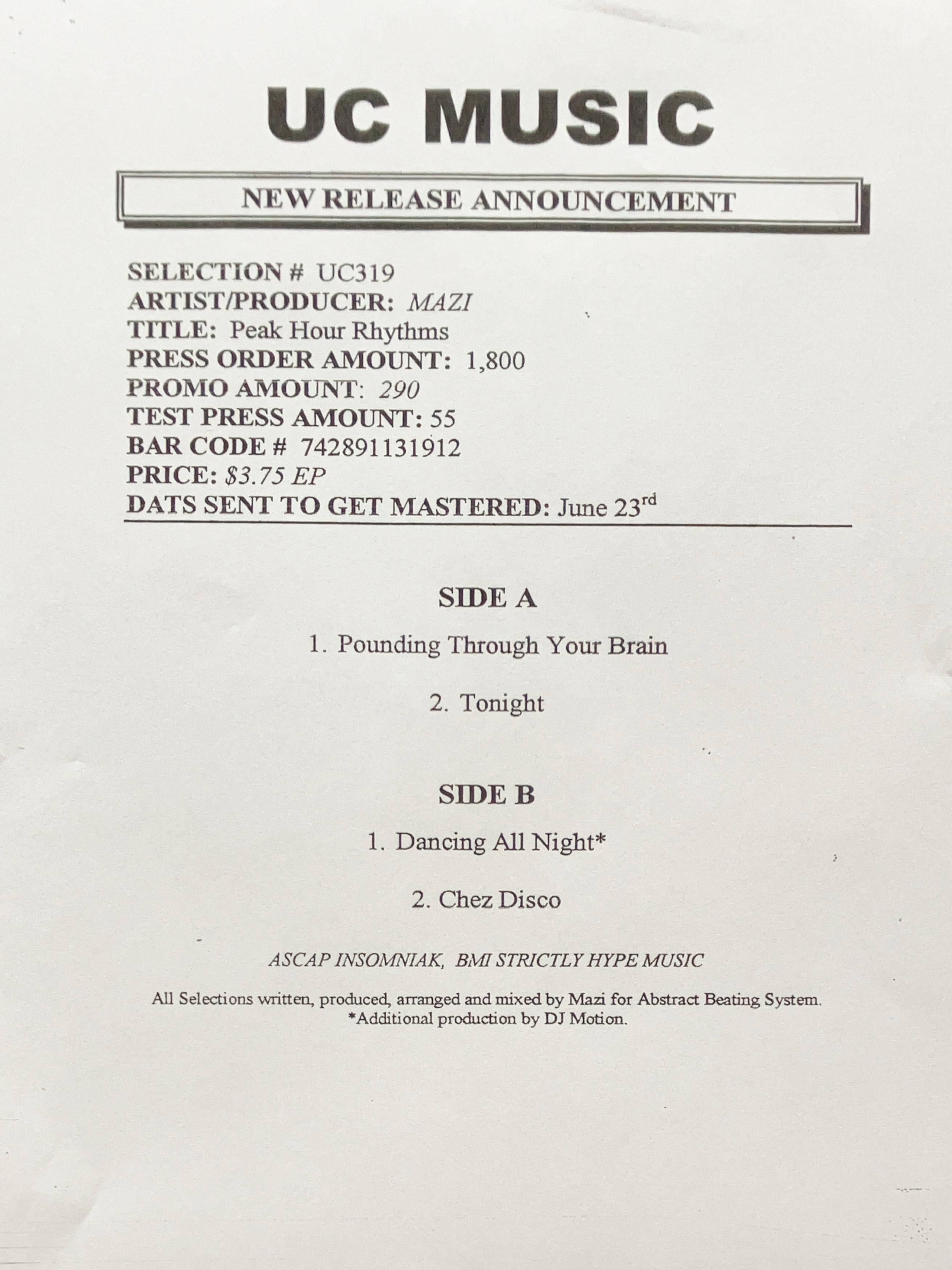 【12”】Mazi / Peak Hour Rhythms (Underground Construction) (UC 319)