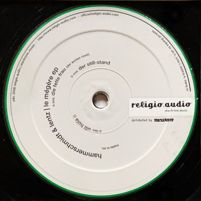 NeutonがディストリビュートしていたドイツのレーベルReligio.Audioから、レーベル主宰Hammerschmidt & Lentzがリリースした1枚。 2008年リリース作品。 盤質 B 細かいスレが多く見られますが、針飛びはしません。 ジャケットの一部(表面/左辺・裏面/センター右側)に小さい破れが見られます。(写真3,4枚目参照) Tracklist A) Die Fette Frau (Der Weiber Rave!) B1) Der Still-Stand B2) Ulli Hola (!) https://www.cpvinyl.com/search?q=Religio+Audio 10851
